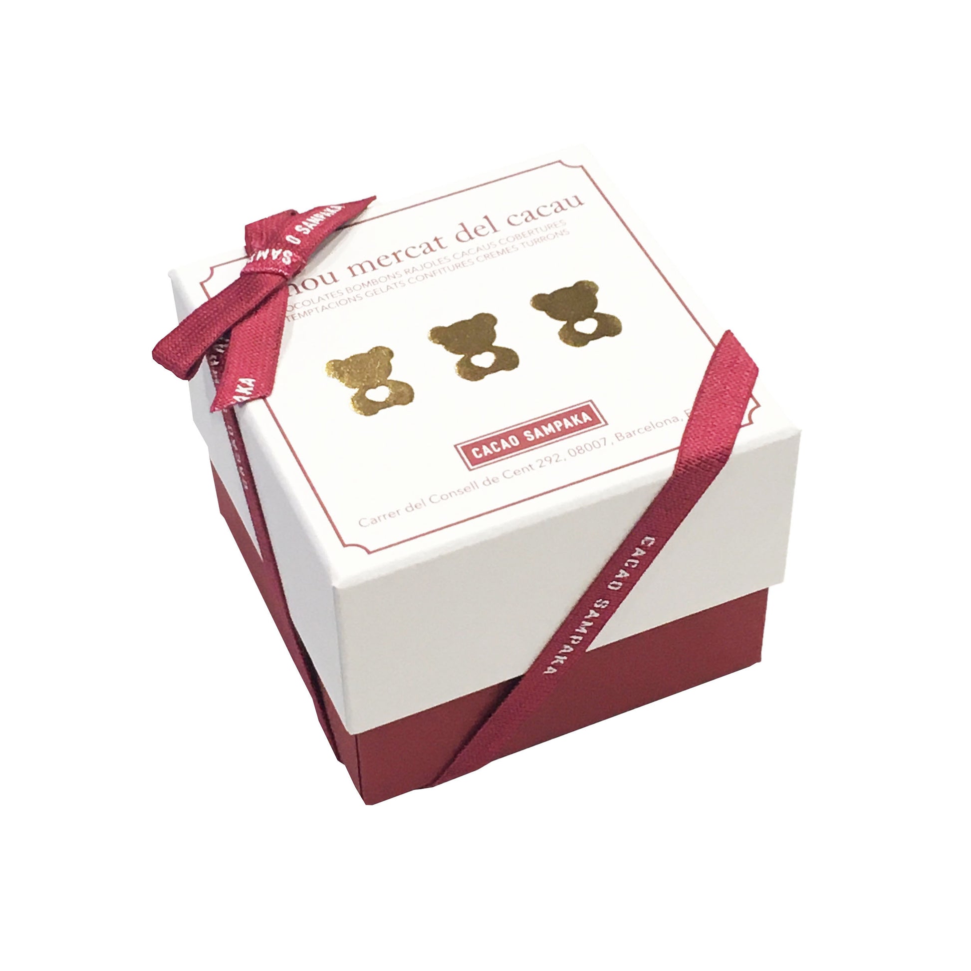 ボンボン1個は約7~8.5g、サイズは2cm~3cm前後、ラジョラス(板チョコレート)は約7cm× 14.5cm、重さ約45gですが、カカオサンパカのチョコレートは熟練した職人の手作業によって1つ1 つ丁寧に作られています。そのため形状や重さが多少異なりますので、予めご了承下さい。